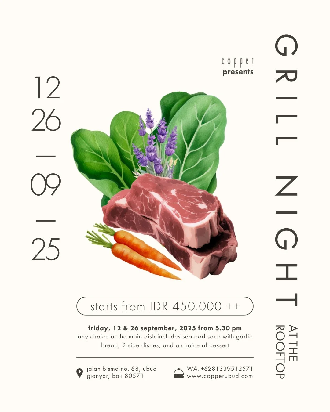As you step out onto the rooftop terrace, the aroma of a sizzling grill fills the air. The ambiance is perfect for a relaxing evening with friends or a romantic date night. The menu offers a variety of mouth-watering steak cuts, luscious chicken, ribs, and lamb chops cooked to perfection, accompanied by a selection of sauces and sides. Savor each bite as you take in the Ubud’s stunning evening sky. A night of indulgence and elegance awaits on the rooftop.