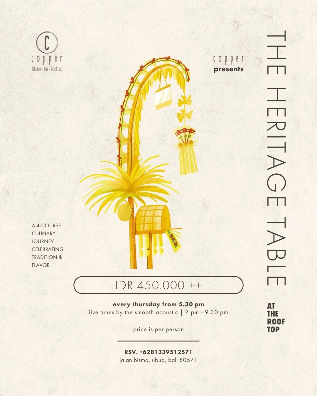 Embark on a gastronomic journey with The Heritage Table: A 4-Course Flavor through Heritage, an exquisite dining experience inspired by time-honored traditions and culinary artistry. Featuring dishes such as the savory West Sumatran Beef Rendang, braised to perfection with rich, local spices, this curated menu celebrates the essence of cultural heritage through flavor. Savor classics like Ketoprak Jakarta, an Indonesian vegetable salad with tofu and nut sauce, or relish the Ikan Bakar Jimbaran, a charcoal-grilled fish with watercress salad and fragrant garlic rice.