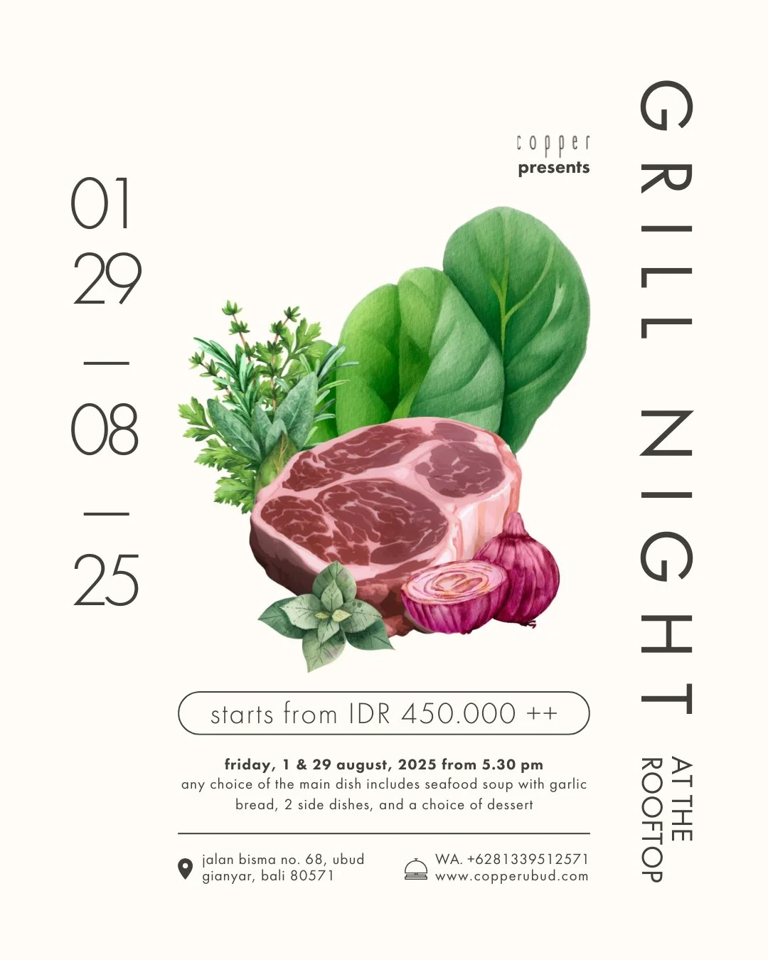 As you step out onto the rooftop terrace, the aroma of a sizzling grill fills the air. The ambiance is perfect for a relaxing evening with friends or a romantic date night. The menu offers a variety of mouth-watering steak cuts, luscious chicken, ribs, and lamb chops cooked to perfection, accompanied by a selection of sauces and sides. Savor each bite as you take in the Ubud’s stunning evening sky. A night of indulgence and elegance awaits on the rooftop.