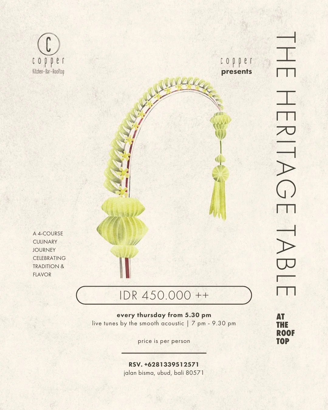 Embark on a gastronomic journey with The Heritage Table: A 4-Course Flavor through Heritage, an exquisite dining experience inspired by time-honored traditions and culinary artistry. Featuring dishes such as the savory West Sumatran Beef Rendang, braised to perfection with rich, local spices, this curated menu celebrates the essence of cultural heritage through flavor. Savor classics like Ketoprak Jakarta, an Indonesian vegetable salad with tofu and nut sauce, or relish the Ikan Bakar Jimbaran, a charcoal-grilled fish with watercress salad and fragrant garlic rice.