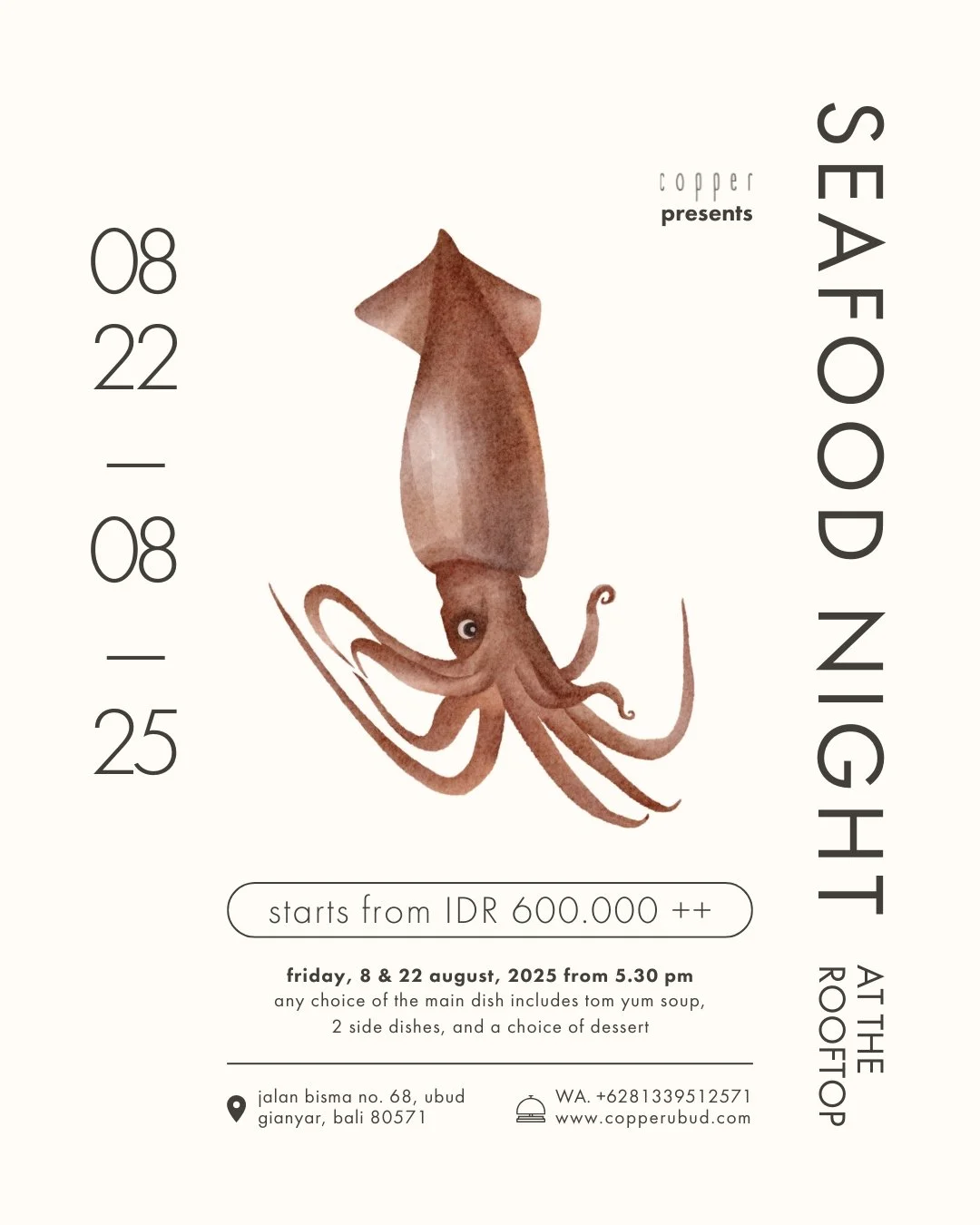 The aroma of grilled seafood wafts through the air tonight! Our menu boasts a delectable selection of the ocean’s most fresh produce including succulent prawns, tender squid, and mouthwatering octopus. Tonight’s highlight is the flavorful lobster grilled to perfection and served in a bamboo log with a variety of zesty dipping sauces. Enjoy tonight’s finest styles of grill cooking under the enchanting Ubud evening sky, truly one you wouldn’t want to miss!